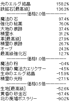 別の話になりますが、マクロ業者の介入が見てとれる結果にもなりました。魔法の粉の価格19897ゴールドは何回打ち込んだことか…データは本文の続きに簡単に載せてあります。行数が多いので折りたたみました。
